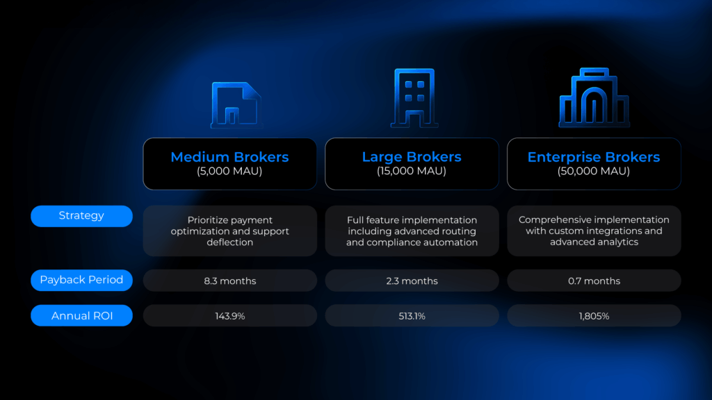 For a hypothetical mid-sized brokerage with 50,000 Monthly Active Users (MAU), financial models forecast a net annual positive impact of $1.5-2.5 million, with payback periods of 12-18 months and three-year ROI exceeding 150% .
